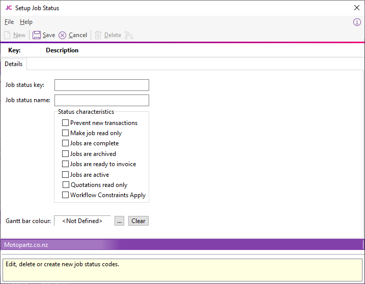 Use a Job Status to indicate the status of a given job. Each status has setting that control whether or not Job Flags are raised when the status changes. A Job Status applies across all Job Types.