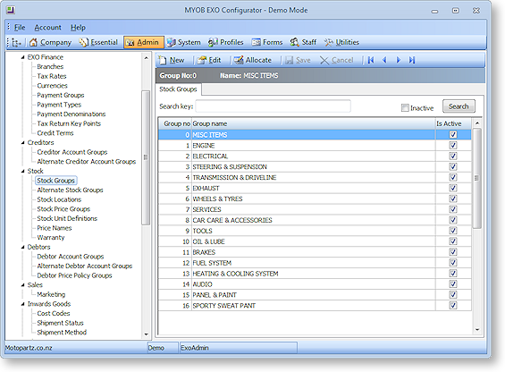 Select Stock > Stock Groups from the Admin menu in EXO Business Config. The Stock Groups window is displayed: