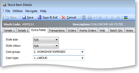 COSTGROUP and COSTTYPE are added to the STOCK_ITEMS table automatically when Job Costing is installed, however by default they do not appear on the Stock Items screen. Add these fields as Extra Fields in EXO Business Configurator > System > Extra Fields. Set up the fields as follows: