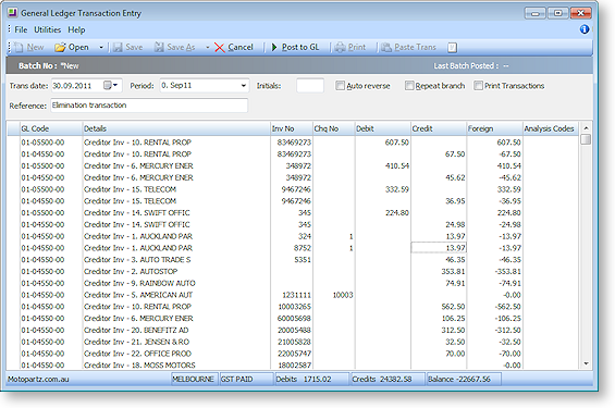 Once all transactions that you want to eliminate have been transferred to the lower grid, click Eliminate to creates a GL Journal to eliminate the selected transactions. A confirmation message appears - click Yes and the journal entry screen appears: