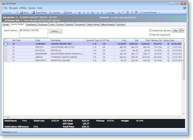To enter quote/ budget information for a job, select the required job and go to the Quote/Budget tab.