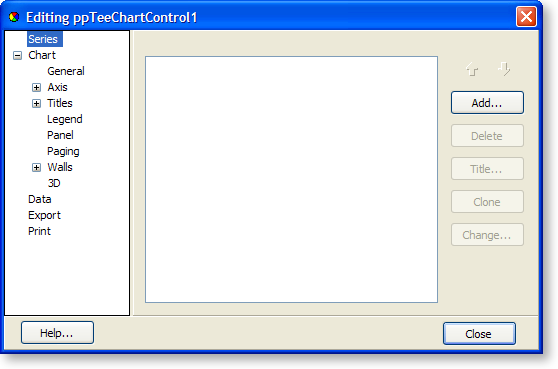 The first TeeChart button is the regular Chart tool. The second button is the DBChart tool, or the data-bound chart tool. The DBChart tool is identical to the Chart tool in functionality and features except that it can take fields in a data pipeline as a source for the data on the chart.