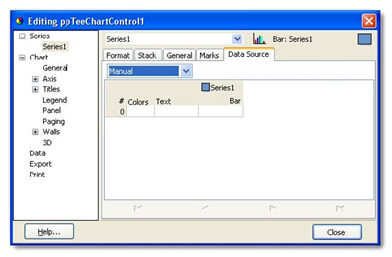 Now that you have added a series, you can add some data to it. Select the new series (it should be called "Series1" or similar) from under "Series" on the property tree on the left, then select the Data Source tab: