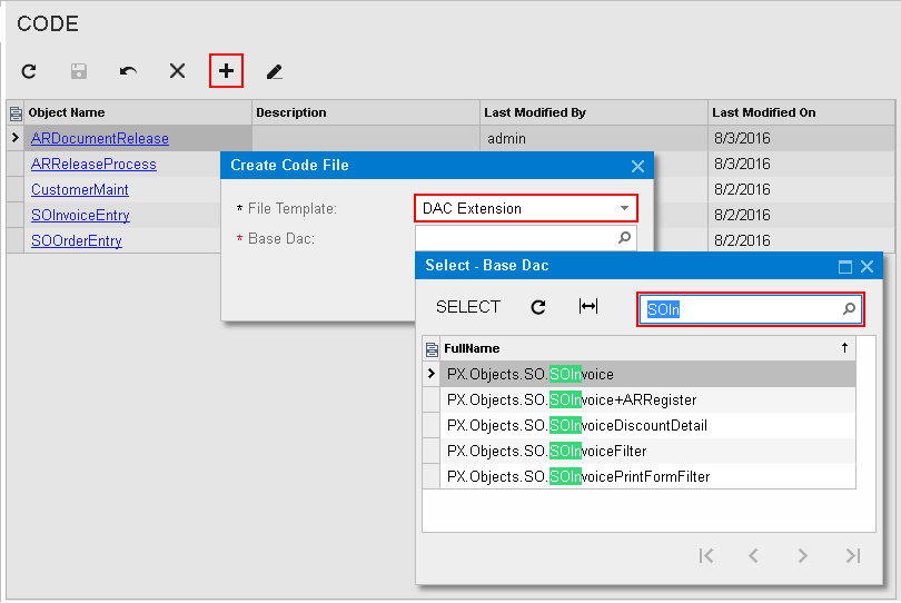If you know the name of the data access class to be customized, you can create a Code item with the DAC extension template on the Code page of the Customization Project Editor by using the Create Code File dialog box.