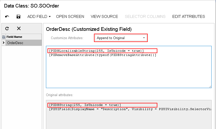 [PXMergeAttributes(Method = MergeMethod.Merge)] [PXDBLocalizableString(255, IsUnicode = true)] protected void DACName_FieldPropertyName_CacheAttached(PXCache cache) { } - Click Save on the editor toolbar to save the changes to the customization project.