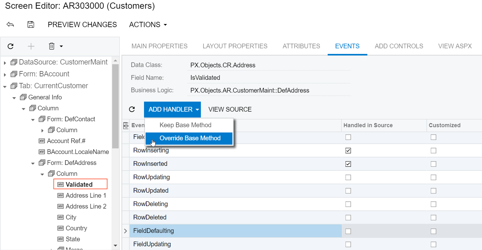 You can use the Screen Editor to add to the appropriate customization code a workable template of an event handler that overrides the base event handler for a data field (or data record). To do this, perform the following actions: