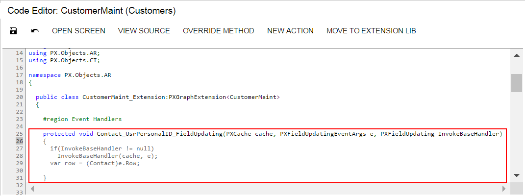 If there is no extension for the graph that provides business logic for the form in the customization project, the MYOB Acumatica Customization Platform creates a template for the extension and saves it as a Code item in the database. Then the platform adds to the graph extension a template for the event handler highlighted in the list and opens the Code item in the Code Editor, as shown in the following screenshot.