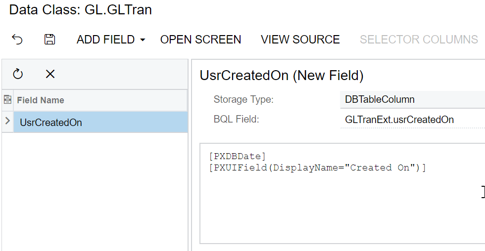 GLTranExt tranExt = Base.Caches[typeof(GLTran)].GetExtension<GLTranExt>(tran); tranExt.UsrCreatedOn = context.CATranRecord.CreatedDateTime;The complete code of the CAReleaseProcess_Extension class should look as follows.