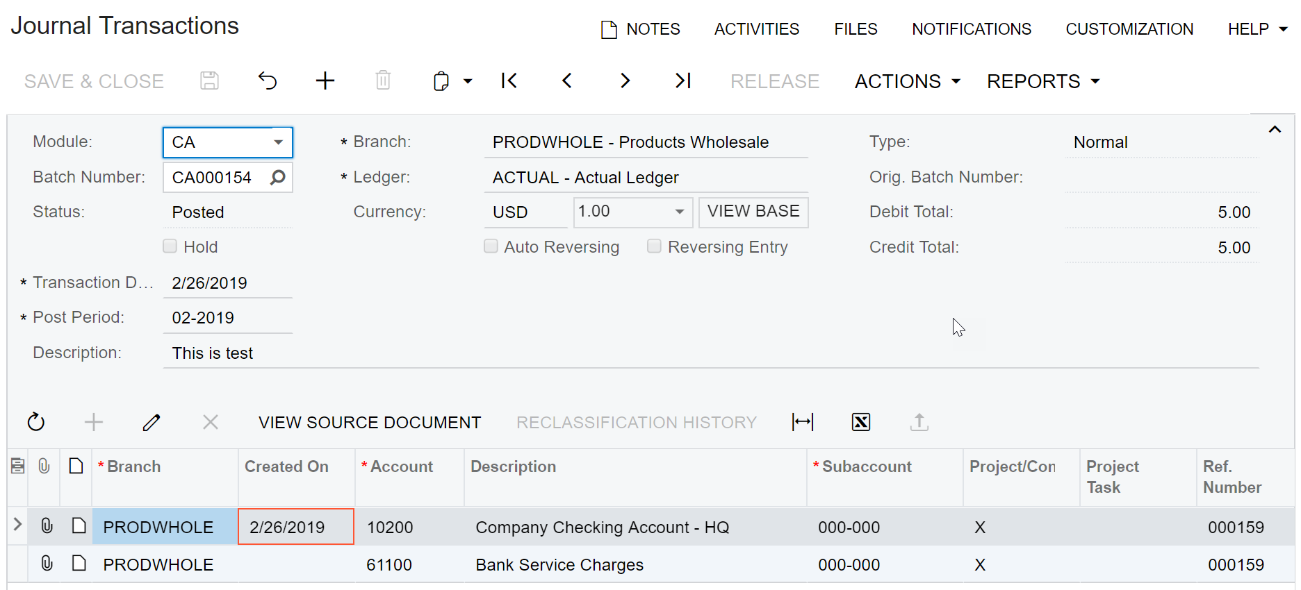 - The Journal Transactions form opens. Note the Created On column