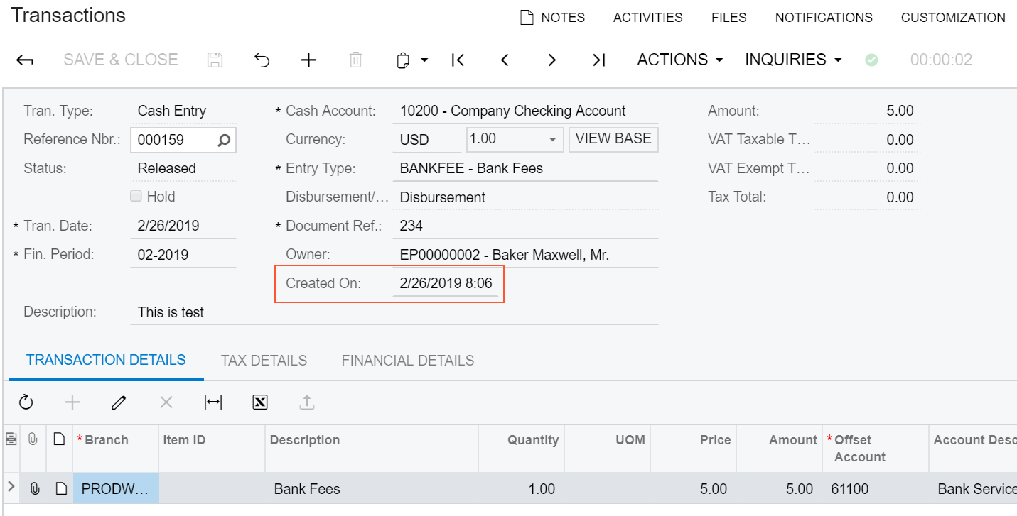 - Open the Transactions form. Note the Created On field in the