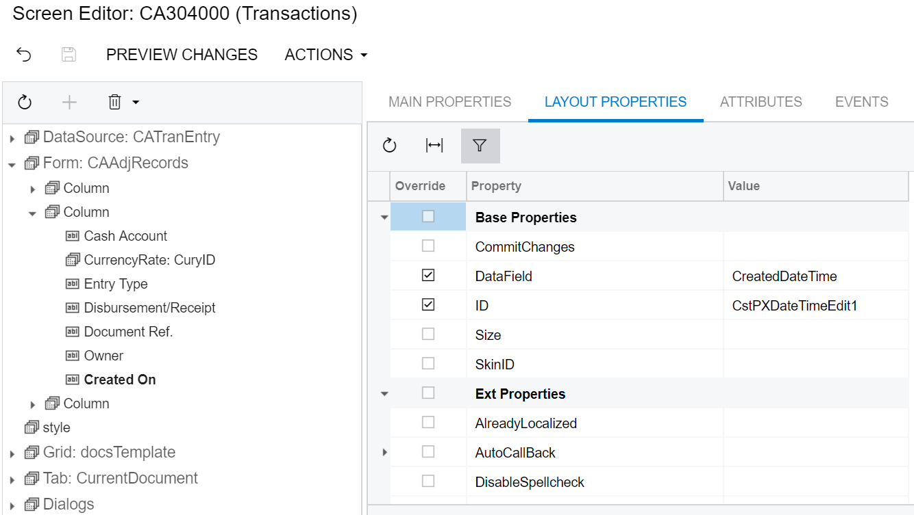 For example, add the CreatedDateTime field of the Transactions data view. The customized screen in the Screen Editor is shown on the screenshot below.