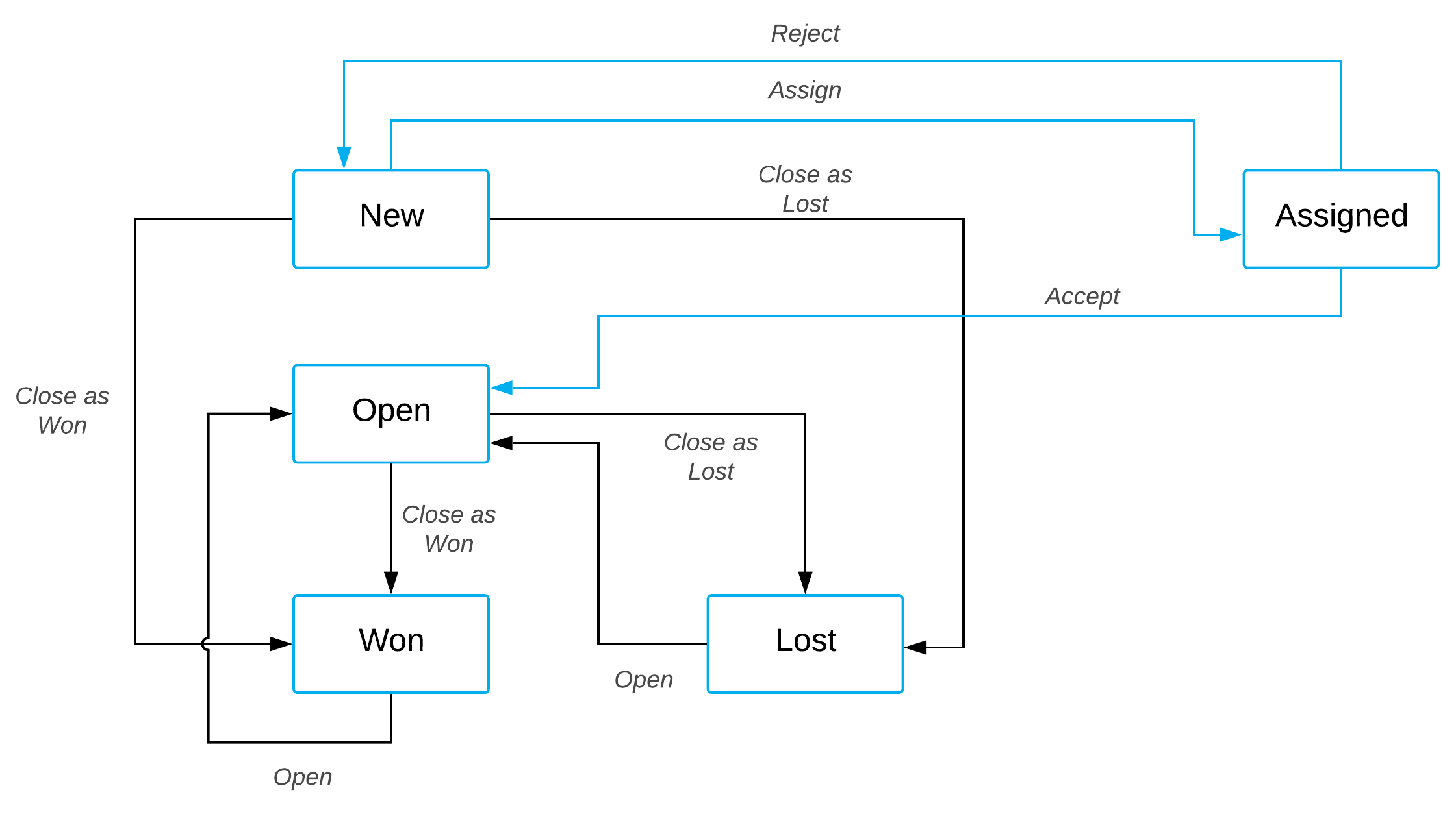 This example demonstrates the extending of the workflow for working with an opportunity by using Visual Studio. The predefined workflow for the Opportunities (CR304000) form includes the states (shown in the blue rectangles and representing statuses) and actions shown in the following diagram.
