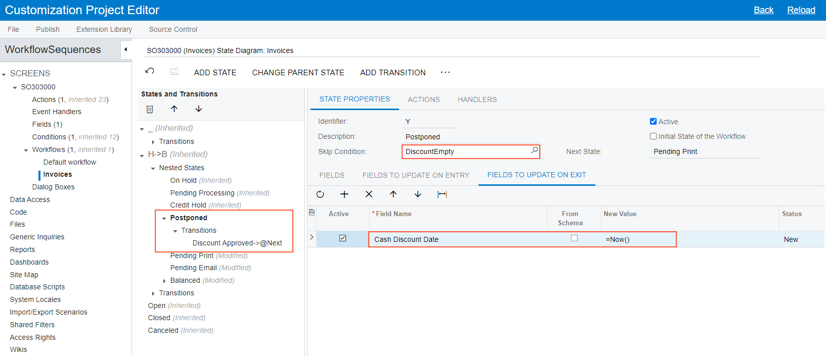 Suppose that you want to add a new state, Postponed, to the workflow for the Invoices form after the Credit Hold state, specify a skip condition for it, and add a transition from this state to the next state in the workflow. [1]Consider adding a couple sentences before this to develop the context. I read the whole example not really knowing what the point of Postponed is, and I think everything would have been clearer if I'd had an overview of what the state is accomplishing. That is, say in ordinary words the following: - What is the point of the Postponed state? How does it fit into the processing of the document? What does it reflect about the invoice or credit memo? - What is the skip condition and what will result from it? "The skip condition will check for no cash discount being applied to the invoice or credit memo, and if it is met, ..."tl3_f1d_xsb2022/03/0215:29:15-05:00TBD2tl3_f1d_xsb22022/03/1615:07:28+03:00The example in this topic demonstrates how you can do this.