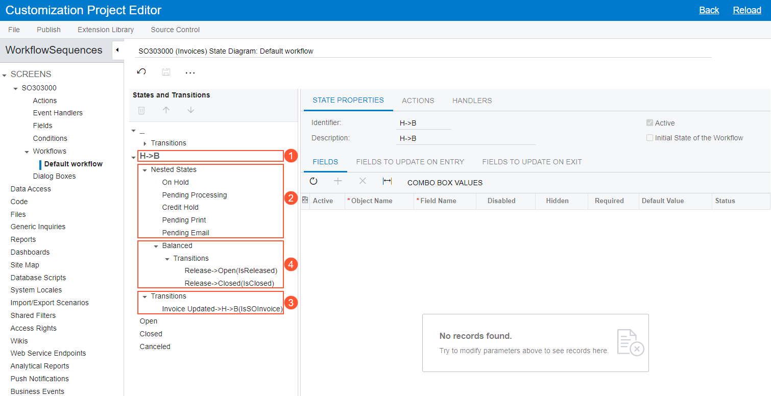 The screenshot below shows the default workflow of the Invoices (SO303000) form on the State Diagram: Default Workflow page of the Customization Project Editor. The composite state (see Item 1 in the screenshot) contains nested states (Item 2) that are part of a typical invoice workflow, as well as transitions (Item 3) to and from the composite state and the nested states. Notice that the Balanced nested state also contains transitions (Item 4).