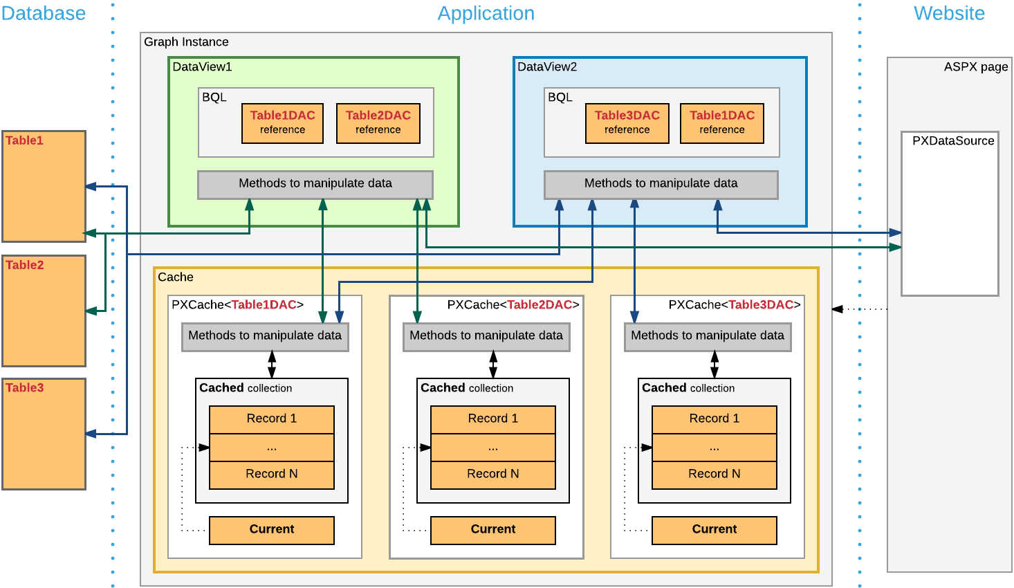 Each graph contains the Caches collection of cache objects and the Views collection of data view objects. The framework handles these objects automatically; you don't have to initialize and control them. A PXView data view object contains two main parts: