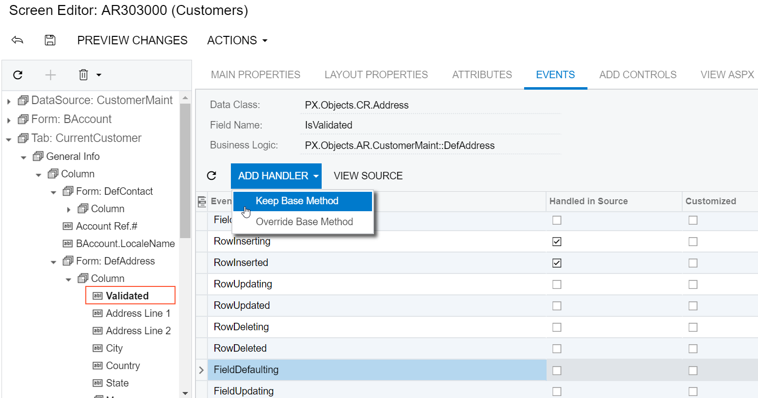 - On the list toolbar, click Add Handler > Keep Base Method.