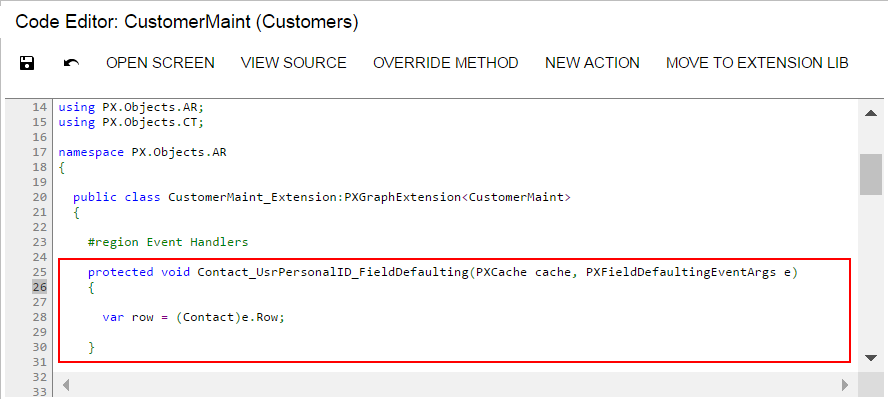 If there is no extension for the graph that provides business logic for the form in the customization project, the MYOB Acumatica Customization Platform creates a template for the extension and saves it as a Code item in the database. Then the platform adds to the graph extension a template for the event handler highlighted in the list and opens the Code item in the Code Editor, as shown in the following screenshot.