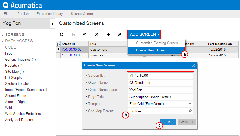 - On the page toolbar, click Create Screen, as item a in the screenshot below shows.