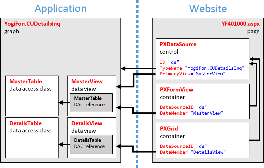 For example, if you enter in the Create Screen dialog box the values that are displayed in the screenshot above, the wizard creates code templates for both the CUDetailsInq business logic controller and the YF401000 page, which contain all the components required for the form template to work properly (see the following diagram).