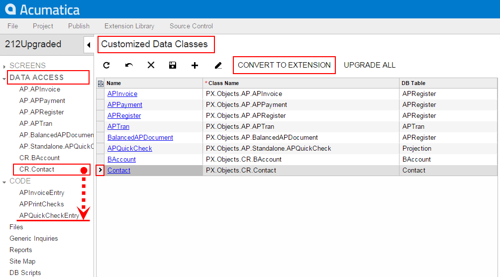 - On the page toolbar, click Convert to Extension.Attention: This action can be applied for only data access classes customized using the technology based on extensions. If you have legacy DAC customization, upgrade it before converting DAC items to class extensions. See To Upgrade Technology for Legacy DAC Customization for details.