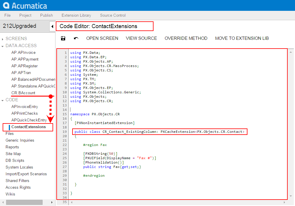 The system obtains the name of the Code item from the DAC name by appending the Extensions suffix to it. After the publication of the customization project, the actual customization code of the class is available in the <DACName>Extensions.cs file in the App_RuntimeCode folder of the website. For example, if you apply the action to the CR.Contact class, as shown in the screenshots above, the operation converts the DAC item to the Code item, automatically giving it the name of ContactExtensions. The action removes the CR.Contact DAC item class from the project and adds the ContactExtensions Code item.