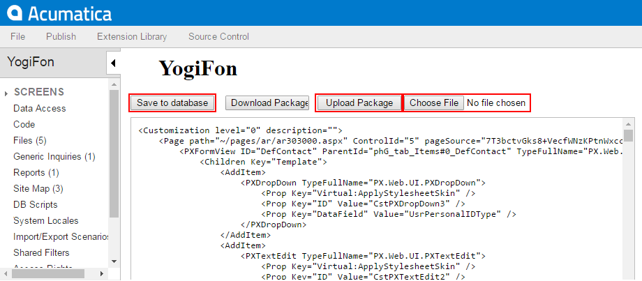 On the editor toolbar, click Upload Package.Figure 1. Replacing the content of a customization project from the Project XML