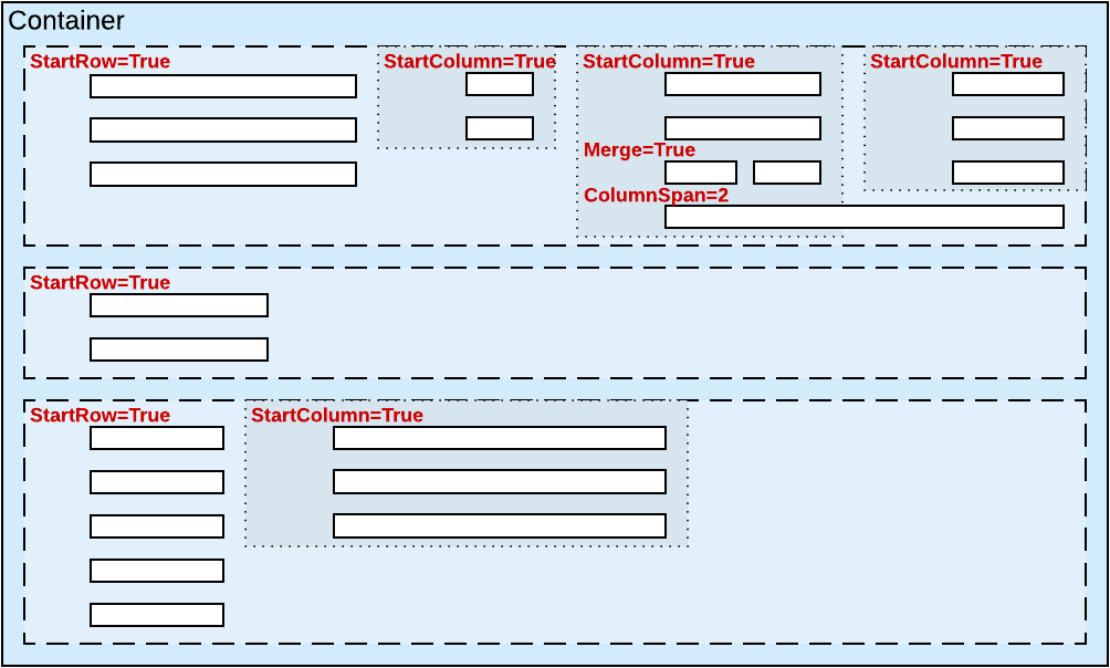 | StartRow | If set to True, starts a new row for the controls following this rule. (See Use of the StartRow and StartColumn Properties of PXLayoutRule in the MYOB Acumatica Framework Guide for details.) |
