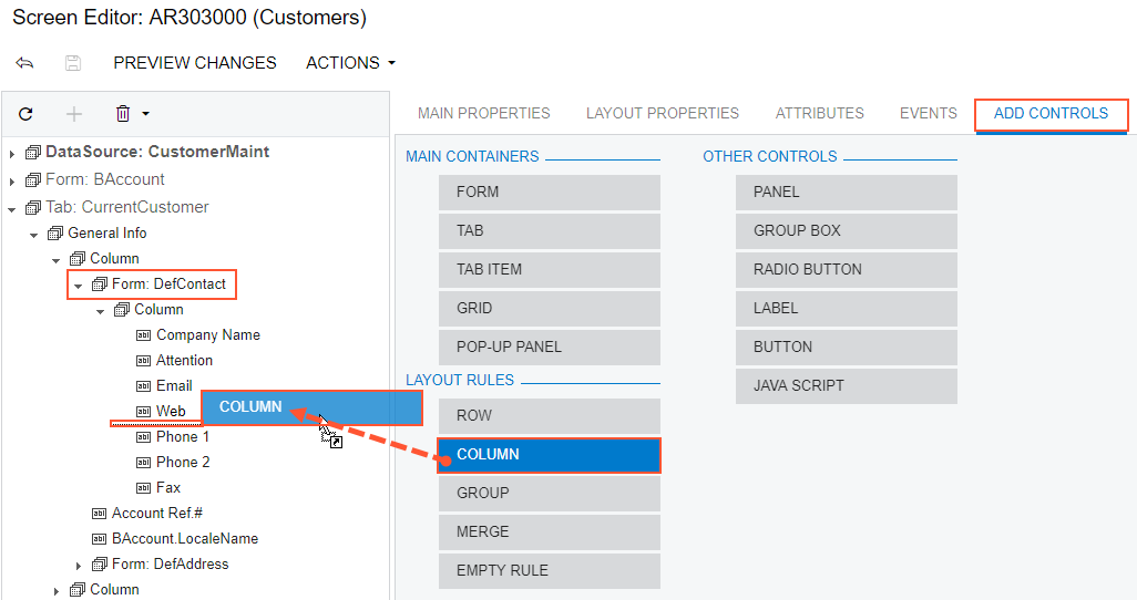 Tip: A layout rule is visible on the customized form only if it contains at least one visible control. - If required, specify properties for the new layout rule.Tip: In any rule, you can configure any properties that you need. Some properties affect only the next control under the PXLayoutRule component, while other properties affect all controls under the rule until the next rule is encountered. Some properties require a corresponding ending rule. See To Set a Layout Rule Property for details.