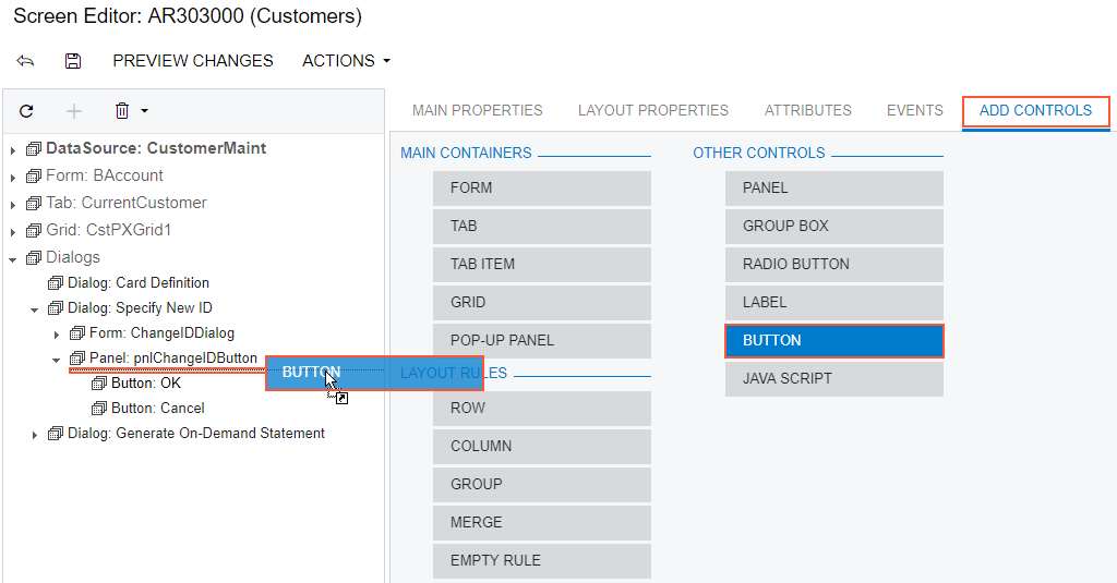 You use the Screen Editor to add to a container a control of any of the following types, which are supported in the MYOB Acumatica Customization Platform (listed under Other Controls on the Add Controls tab item):