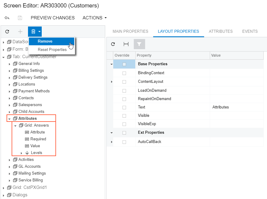 Attention: If you delete a PXLayoutRule component, all the controls under this layout rule are deleted too. - Click Save on the toolbar of the Screen Editor to save your changes to the customization project.