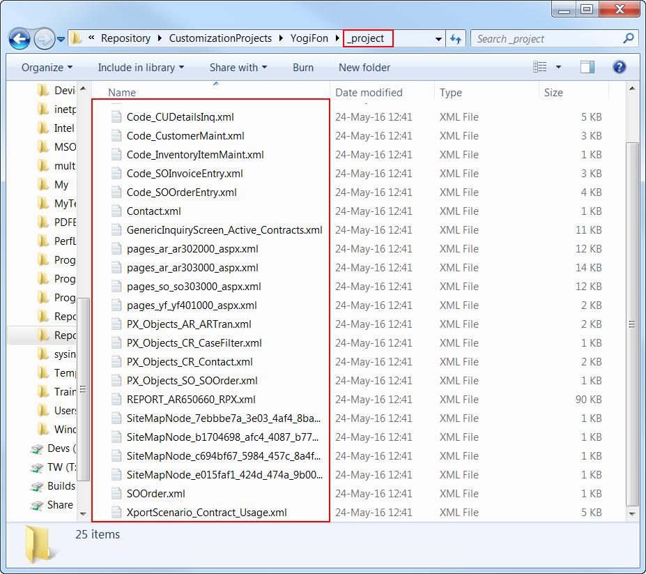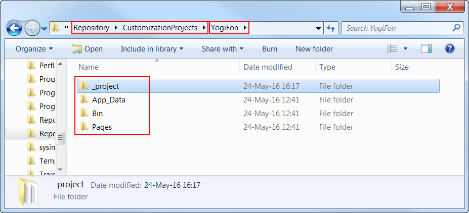 If the customization project contains custom files, the platform keeps the paths to these files. Therefore, the project folder includes the corresponding folders for these custom files, as shown in the following screenshot.