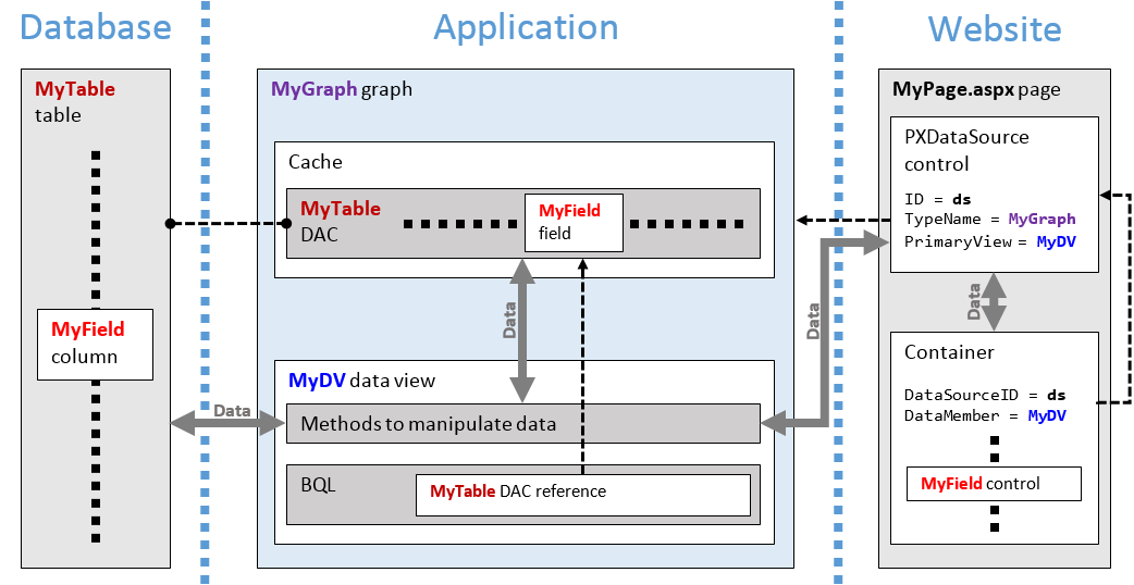 TypeNameproperty of the data source control of the page. The graph must contain at least one data view, which is specified in thePrimaryViewproperty of the data source control as well as in theDataMemberproperty of the control container. The graph instance is created on each round trip and initializes the creation of the data view instance based on a BQL statement. The data view provides data manipulations and data flows between the container control, the cache object of the graph, and the corresponding table of the database. The BQL statement contains a reference to at least one data access class that is required to map the database table to data records in the cache object. - A data access class (DAC): On each round trip, the DAC instance is created in the cache object when the data view processes any operation with the corresponding data.