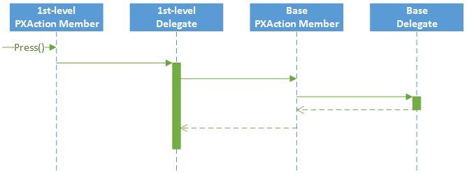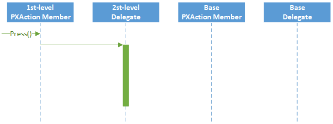 PXAction<>, you prevent the action delegate execution from an infinite loop. Consider the following example of a first-level BLC extension.public class BaseBLCExt : PXGraphExtension<BaseBLC> { public PXAction<DAC> ValidateObjects; [PXButton] [PXUIField(DisplayName = "Validate All Objects")] protected void validateObjects() { Base.ValidateObjects.Press(); } }The Actions collection of a BLC instance contains the ValidateObjects action, which consists of the