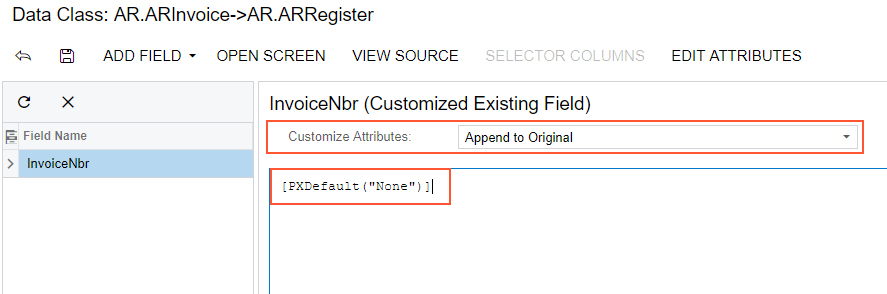 [PXDefault("None")]. - Save your changes in the Data Class Editor.
