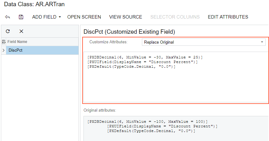 PXDBDecimalattribute, change the minimum and maximum values, as listed below.[PXDBDecimal(6, MinValue = -30, MaxValue = 25)] [PXUIField(DisplayName = "Discount Percent")] [PXDefault(TypeCode.Decimal, "0.0")] - Click Save in the Data Class Editor to save the changes.