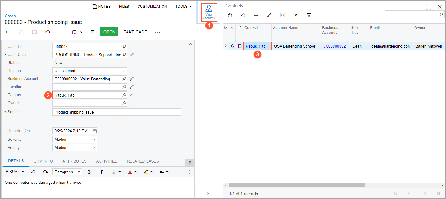 about the contacts of the business account that you selected for the case (Items