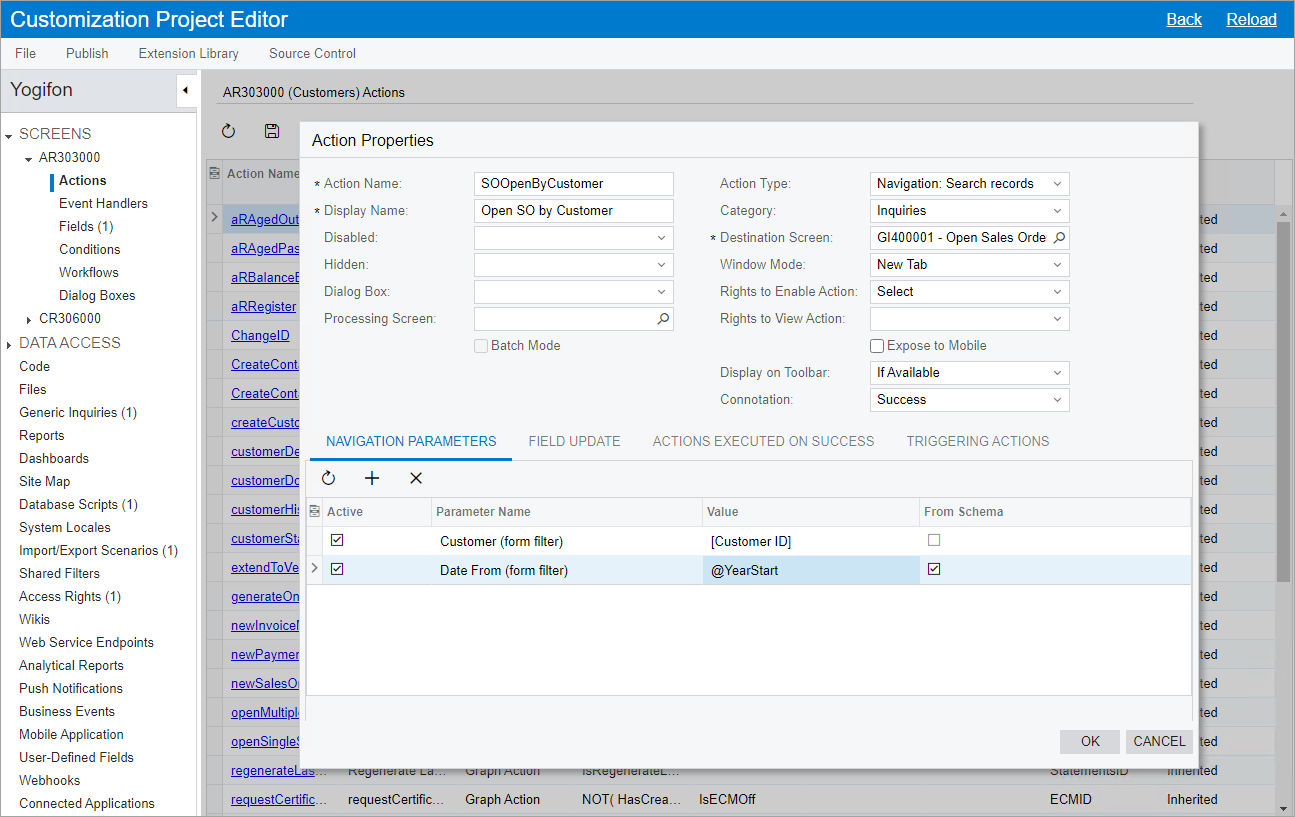 To add an action to the Customers (AR303000) form that opens a generic inquiry form, do the following in the Customization Project Editor for the Yogifon project: