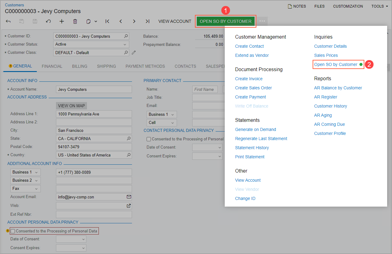 Suppose that management has determined that MYOB Acumatica would better fit the needs of your company if from the Customers (AR303000) form, employees could quickly view the Open Sales Orders by Customer (GI400001) generic inquiry form for the selected customer. You need to add to the form the action that opens this generic inquiry.