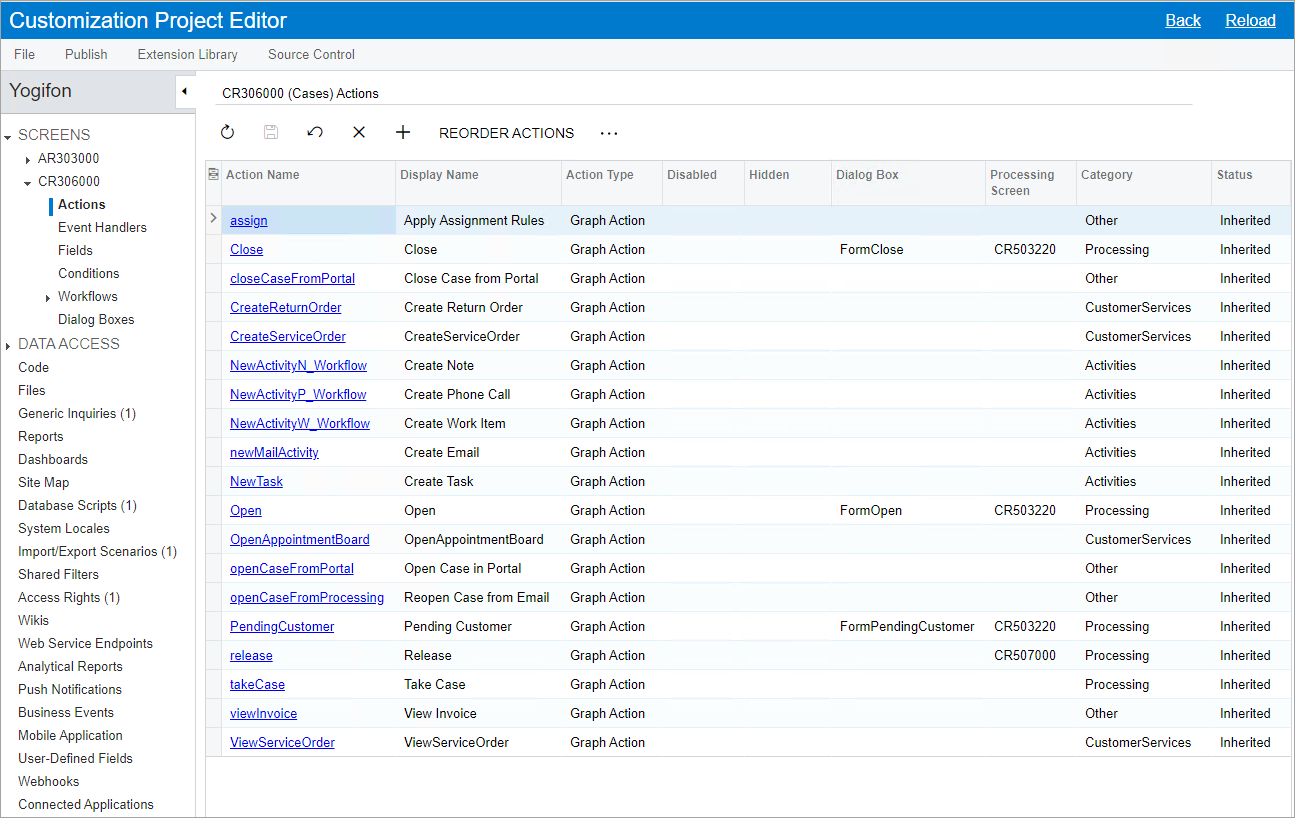 When you want to add an action to a form, you use the Actions page of the Customization Project Editor. The following screenshot shows the Actions page for the Cases (CR306000) form. This page contains predefined actions—that is, actions that are defined for the form in the out-of-the box system.