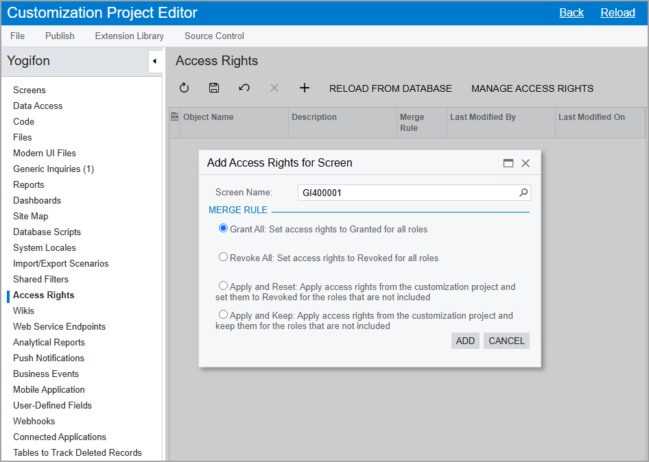 - Click Add to add the access rights to the customization