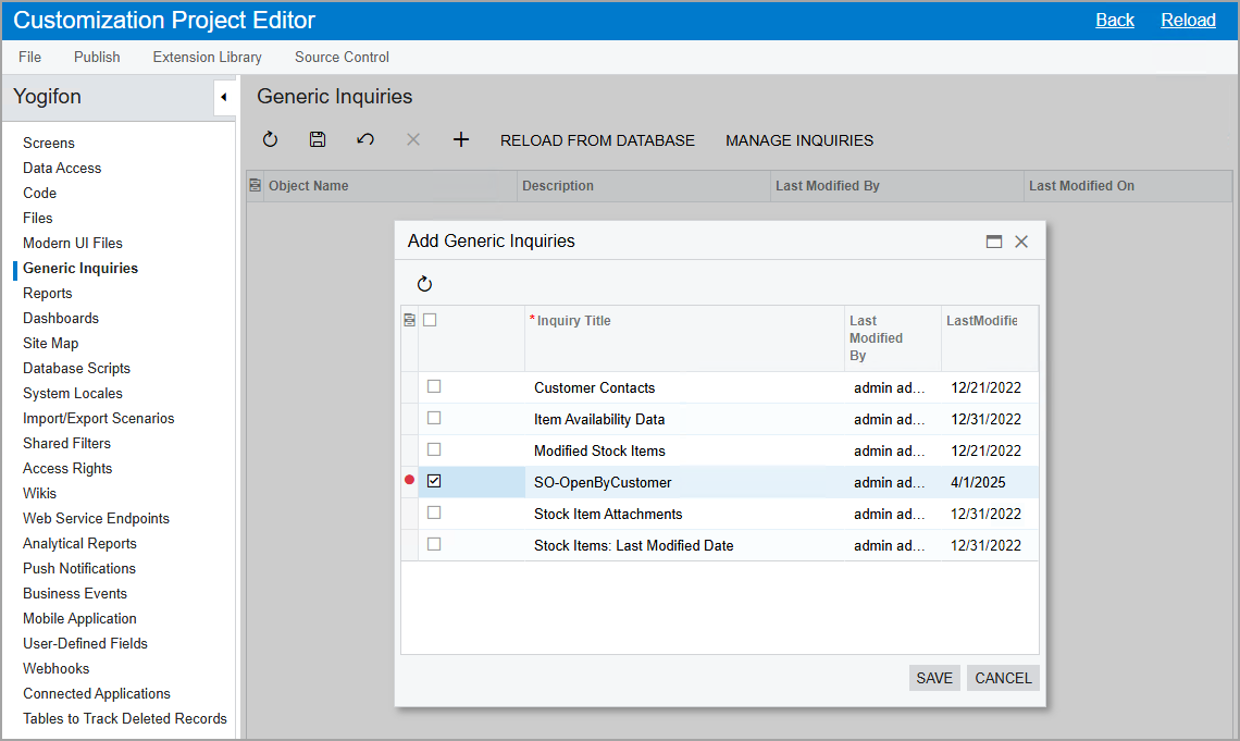 Tip: You do not need to add the Generic Inquiry (SM208000) form to the customization project because a generic inquiry is an entity created on this form but the Generic Inquiry form itself is not changed.