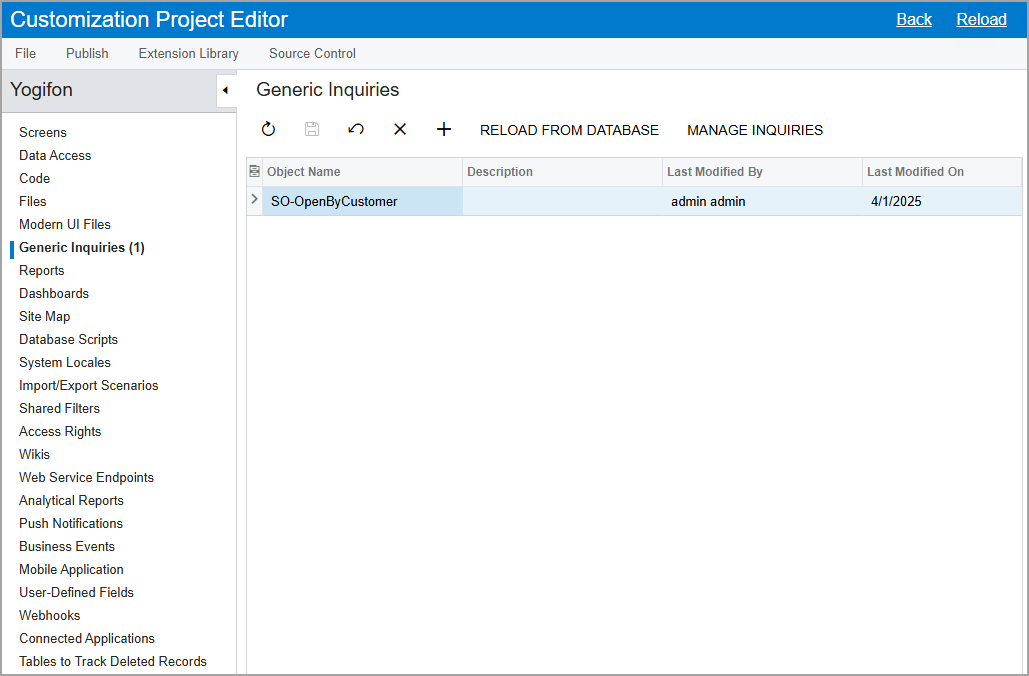The generic inquiry is saved as a customization item in the customization project, as shown in the following screenshot. Notice that it is listed on the Generic Inquiries page and that in the navigation pane, the system has added (1) after Generic Inquiries, indicating that the customization project now includes one generic inquiry.
