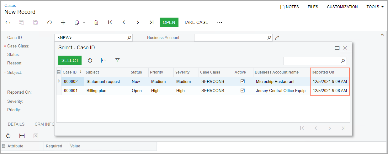 Suppose that you want users to be able to select cases on the Cases (CR306000) form by the date on which they have been reported. You need to change the lookup table for the Case ID box on the form so that it contains the Reported On column.