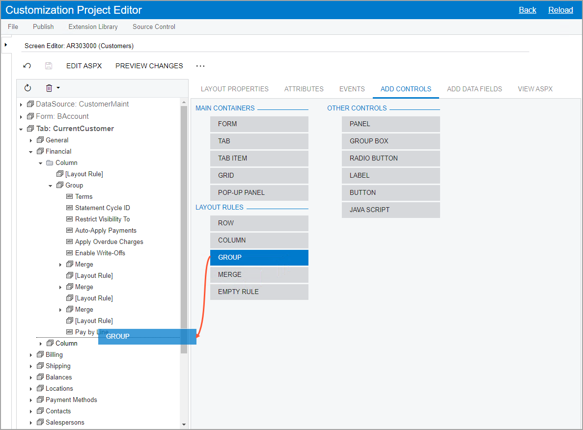 In the Financial node of the control tree, drag the