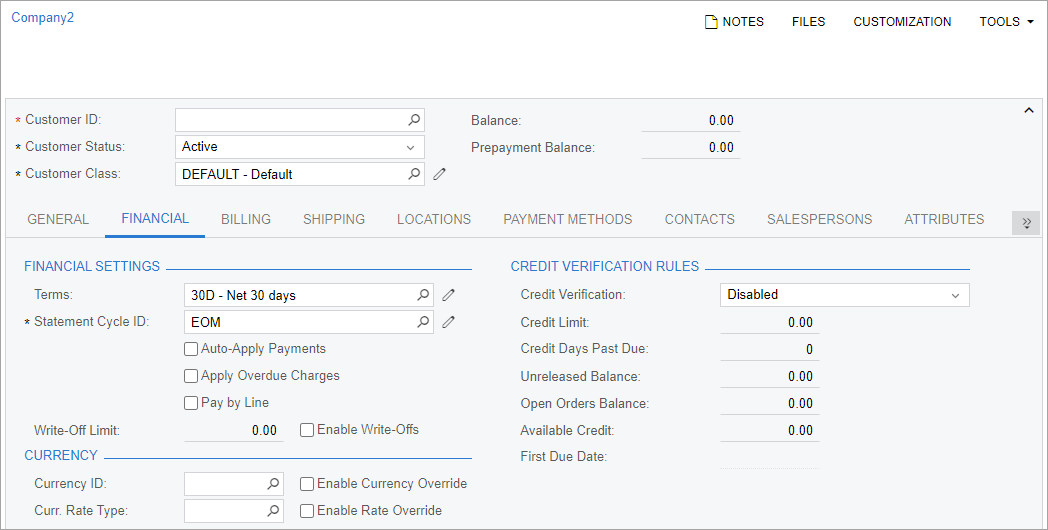 The Financial tab of the Customers form should look as shown in the