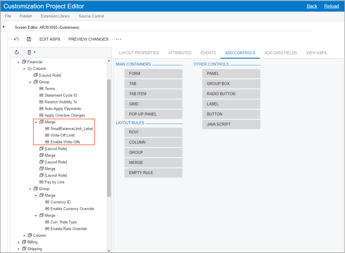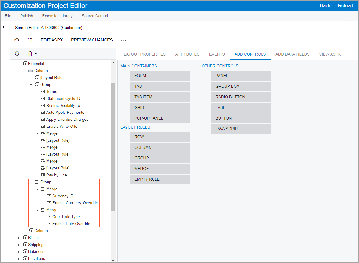 added to the list of forms on the Customized Screens page, and the Screen Editor: CR303000 (Customers page opens.