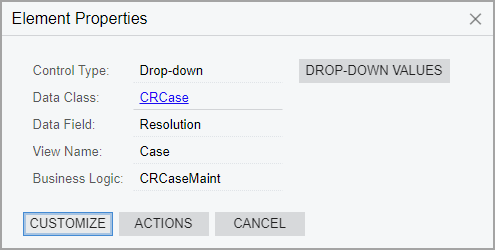 The dialog box displays various properties of the UI element that you clicked, such as its control type, data access class, data field, data view, business logic controller, actions, and drop-down control values. These properties define the visual appearance and business logic of the element. By clicking different buttons and menu commands in the Element Properties dialog box, you can view the source code of the element or start customizing it on the Screen Editor page. For more information, see Customizing Business Logic.