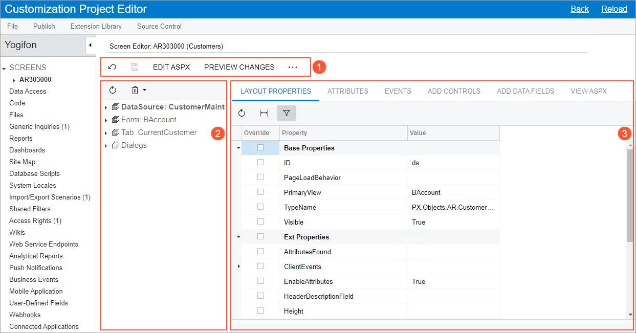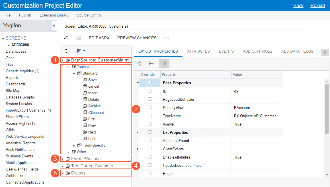 The screenshot below shows the control tree of the Customers (AR303000) form. The first element of the control tree is the DataSource node (see Item 1 in the screenshot). It contains all the actions defined for the form. The actions with associated buttons on the form toolbar and commands on the More menu are located in the Toolbar node (Item 2). This node contains standard actions (the Standard node) and form-specific actions (the Form-Specific node). Form-specific actions are listed under the category of the associated commands on the More menu. All other actions of the form are located in the Other node.