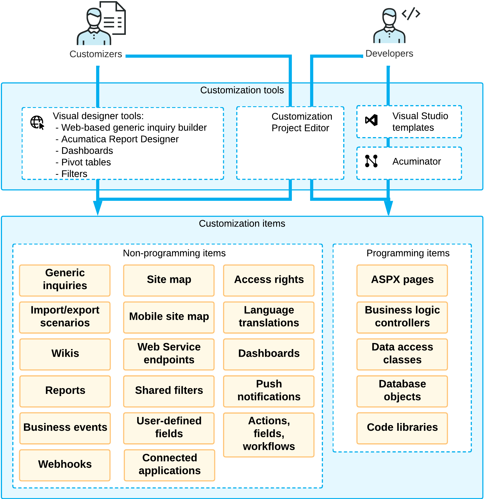 You can customize MYOB Acumatica so that it optimally supports your company's business processes. The following diagram shows the tools that your customizers and developers can use to customize MYOB Acumatica to meet your company's needs. It also illustrates the customization items (described below) that would result from these efforts.