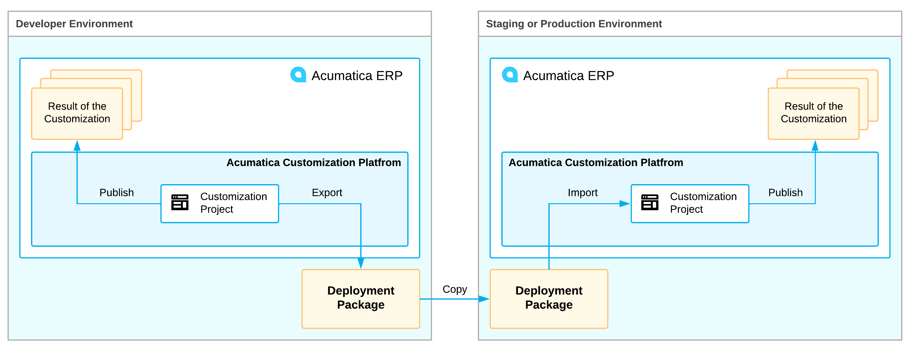 You develop customization projects in the development environment. After you have added all customization items to the customization project and done preliminary testing, you prepare a deployment package to distribute the customization project to the staging or production environment, as shown in the following diagram.
